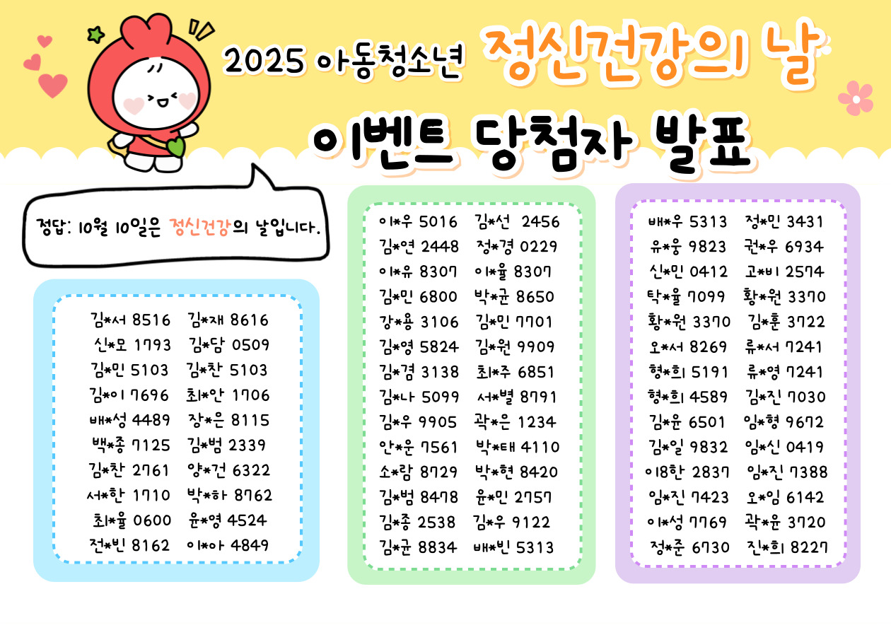 02.861.2284~6 월~금 오전 9:00 ~ 오후 6:00[당첨자발표] 2025 정신건강의 날 아동·청소년 이벤트